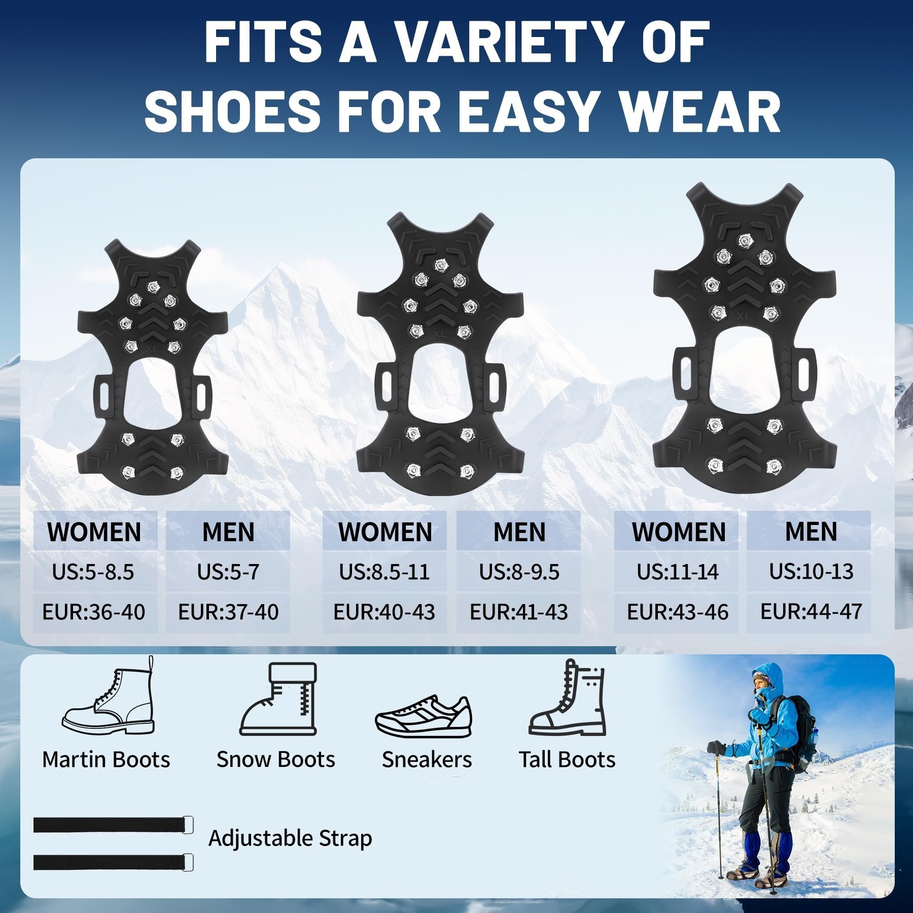 Equipped with 11 durable manganese steel spikes, these crampons deliver 360° traction on ice, snow, and slippery surfaces. Walk, hike, or run confidently without worrying about slips or falls